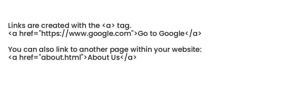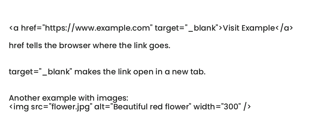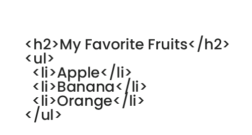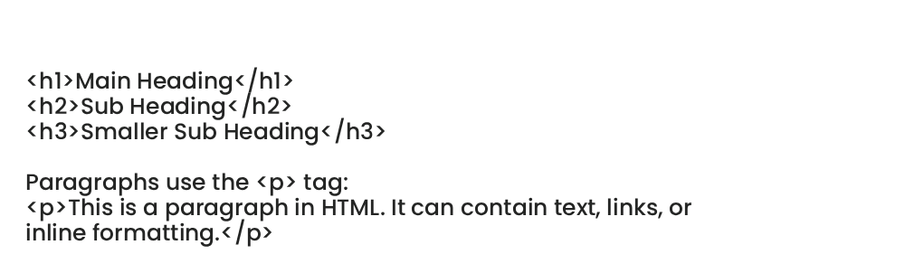 HTML uses tags to mark up content. Tags are written inside angle brackets < >. Here are some basic ones: